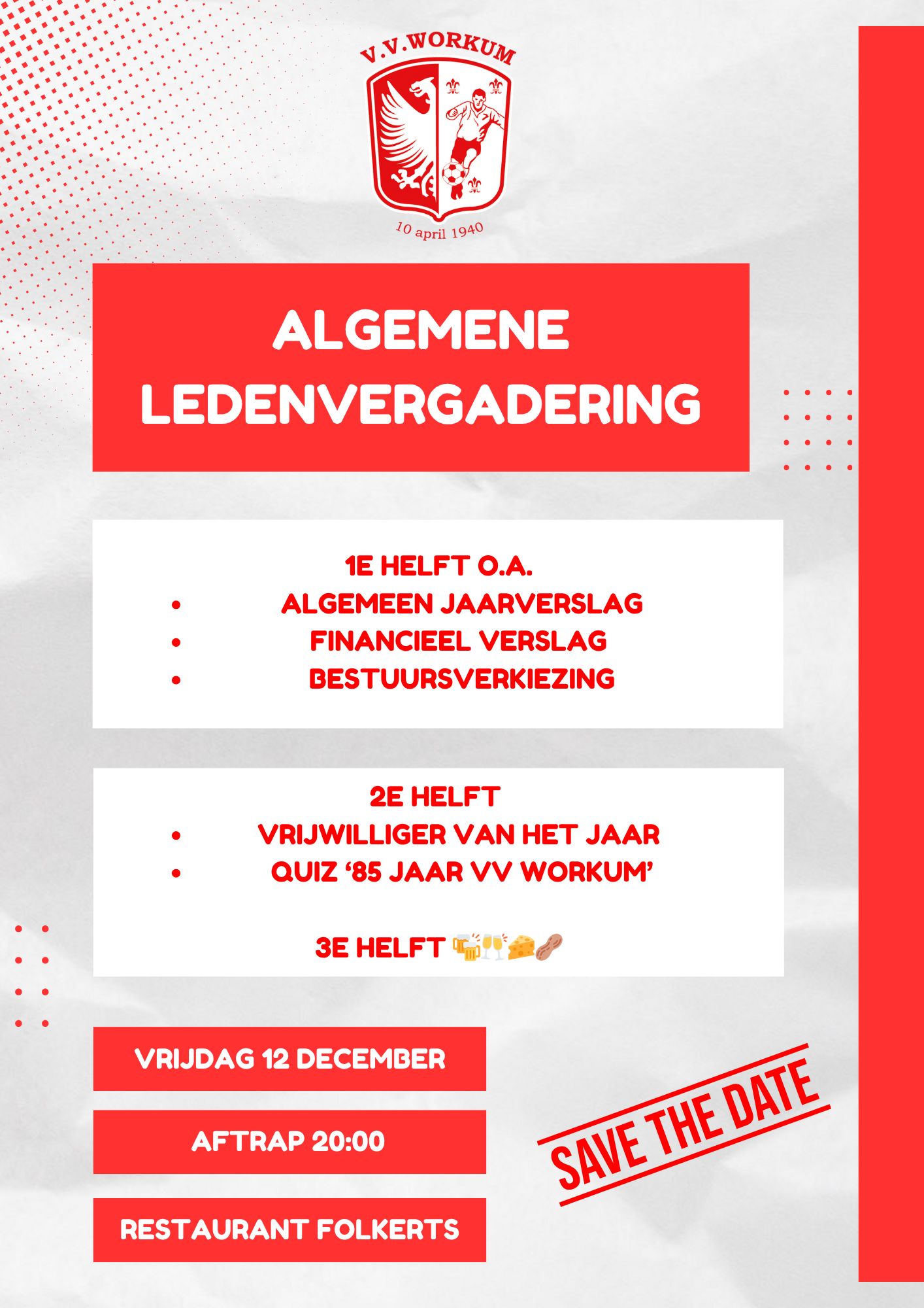 Voor in de agenda! Op 12 december as. houden we onze jaarlijkse ledenvergadering. Met dit jaar een heuse V.V. Workum 85 jaar Quiz! Wees welkom ❤️🤍